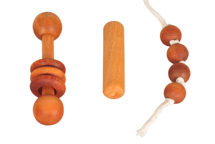 The dumbbell rattle and grasping beads are made from natural Neem wood, and and the interlocking discs are made from beechwood. The toys are sealed with organic oil blends making it completely safe for the child.